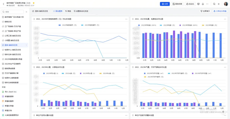 最終完成的儀表盤,改變了廠區(qū)能耗數(shù)據(jù)收集困難、分析困難、及時(shí)性低的問題。通過儀表盤這一新工具將原本獨(dú)立的數(shù)據(jù)整合起來,橫可看每月數(shù)據(jù)變化,縱可查往年同比增長,小可看單體設(shè)備耗能,大可覽全廠能耗起伏。在海陵實(shí)現(xiàn)能源精細(xì)化管理、節(jié)能減排和成本控制目標(biāo)的道路上給予了幫助。項(xiàng)鈺茹還帶著這個(gè)儀表盤參與了9月20日的海陵飛書案例大賽,取得了二等獎(jiǎng)的好成績。